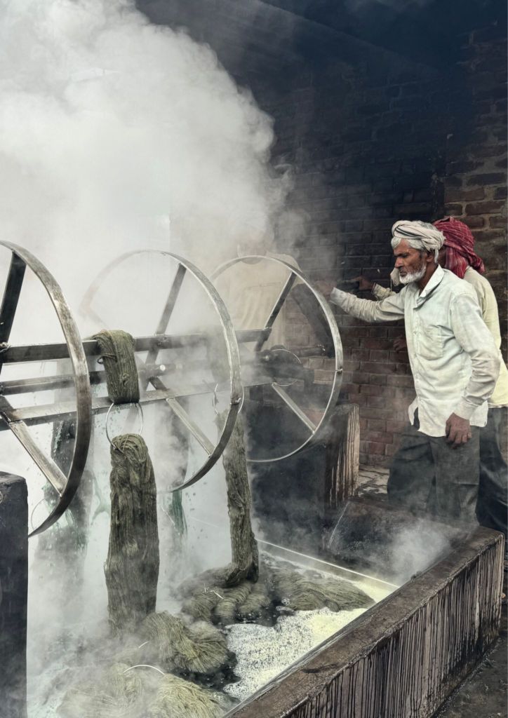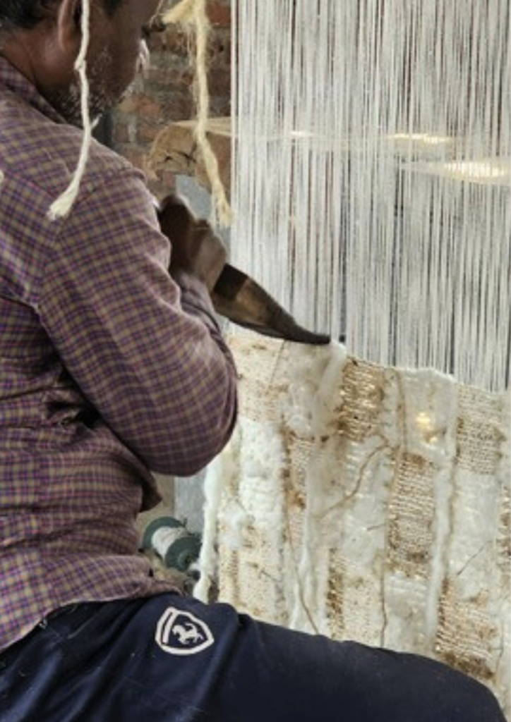 The journey from the loom of rural India to a room could symbolize a profound transition from traditional craftsmanship to modern living.